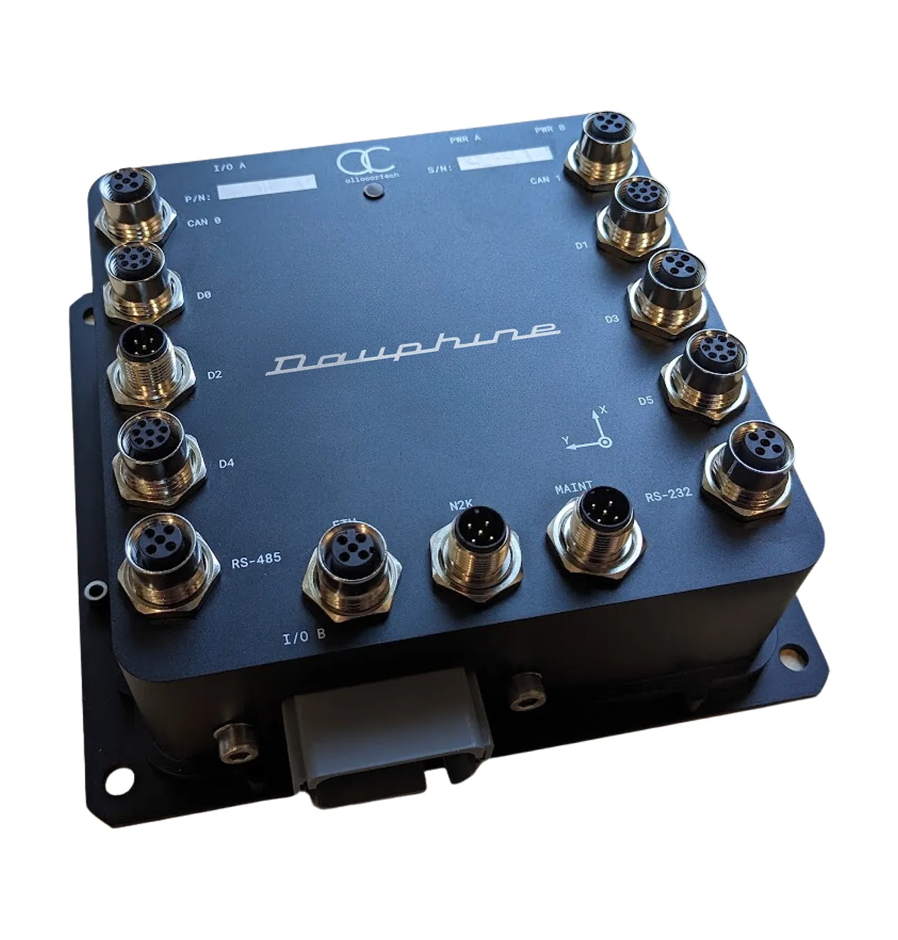 Dauphine is outfitted with a variety of serial communication protocols such as RS-485, RS-232, 5VVTL, CAN-FD, and 10/100 switched Ethernet port in a variety of mappings. It also has General Purpose Input/Output (GPIO) ports that can be used as a remote control receiver and for Pulse wave modulation (PWM).